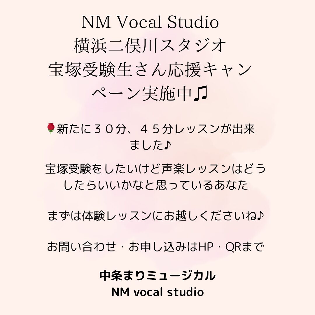 横浜・二俣川・たまプラーザ・都内スタジオ・宝塚その他出張レッスン・オンラインレッスン 宝塚受験生・宝塚音楽学校生・現役劇団生・俳優・声優・ジャズ・ミュージカル・英語歌唱・ミュージカルオーディション対策(東宝・劇団四季・子役)ヴォーカル個人・グループレッスン募集中!